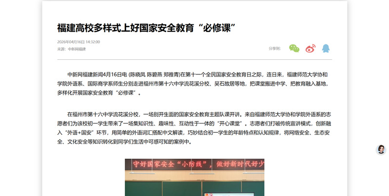 中新网福建新闻4月16日电 (陈晓凤 陈碧燕 郑雅青)在第十一个全民国家安全教育日之际,连日来,福建师范大学协和学院外语系、国际商学系师生分别走进福州市第十六中学流花溪分校、吴石故居等地,把课堂搬进中学、把教育融入基地,多样化开展国家安全教育“必修课”。