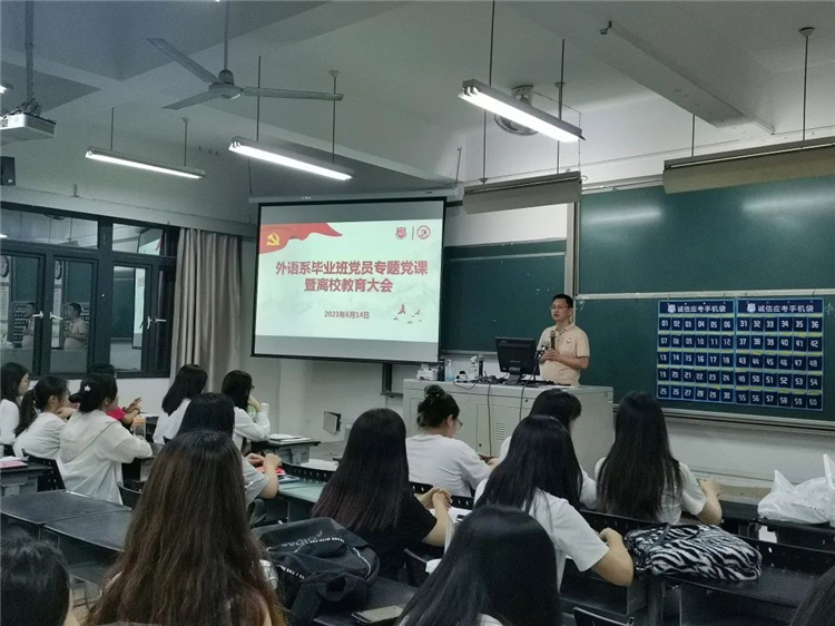 6月14日晚上,福建师范大学协和学院外语系开展主题教育专题党课暨毕业生党员离校教育活动,外语系党总支书记陈跃聪、毕业班辅导员、2023届全体毕业生党员参加活动。