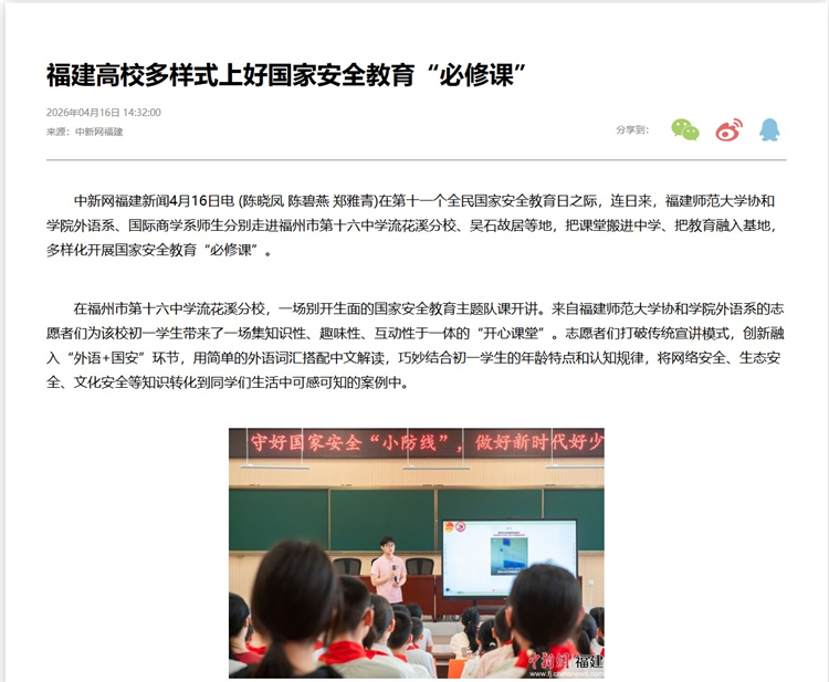 4月16日,中新网福建报道在第十一个全民国家安全教育日之际,福建师范大学协和学院外语系、国际商学系师生分别走进福州市第十六中学流花溪分校、吴石故居等地,把课堂搬进中学、把教育融入基地,多样化开展国家安全教育“必修课”。